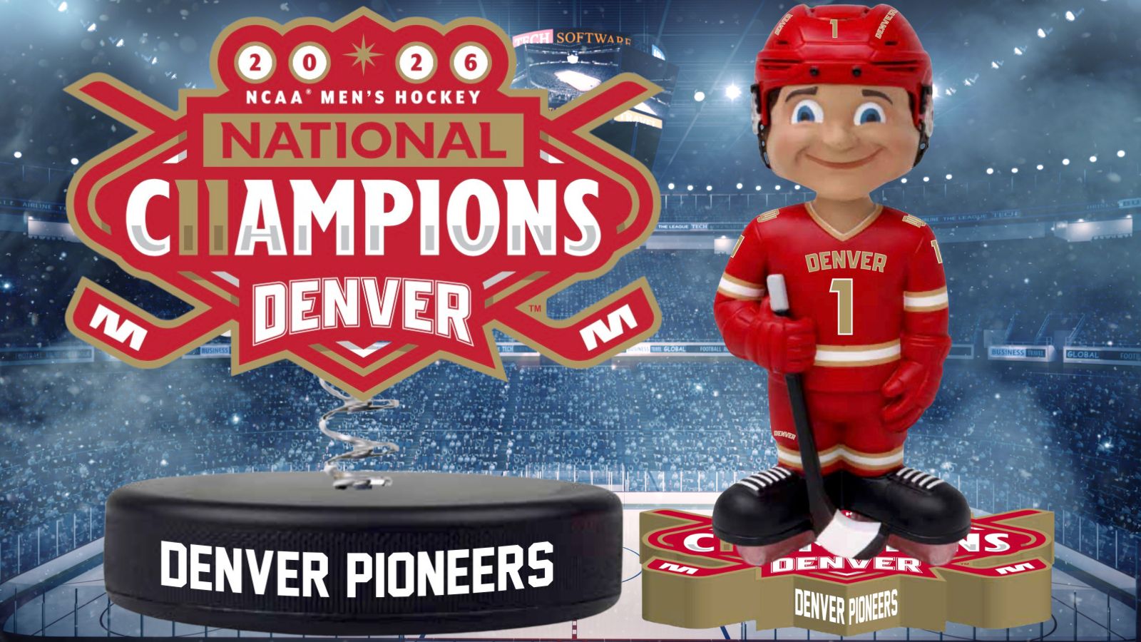 - Proudly wearing a crimson and gold No. 1 Denver sweater and holding a hockey stick, the vintage-style bobblehead is standing on the official 2026 Men’s Hockey National Championship logo. The Bobble Logo features the 2026 Denver Pioneers Men’s Hockey National Championship logo on a hockey puck base. “Denver Pioneers” is prominently displayed on the front of both bases.