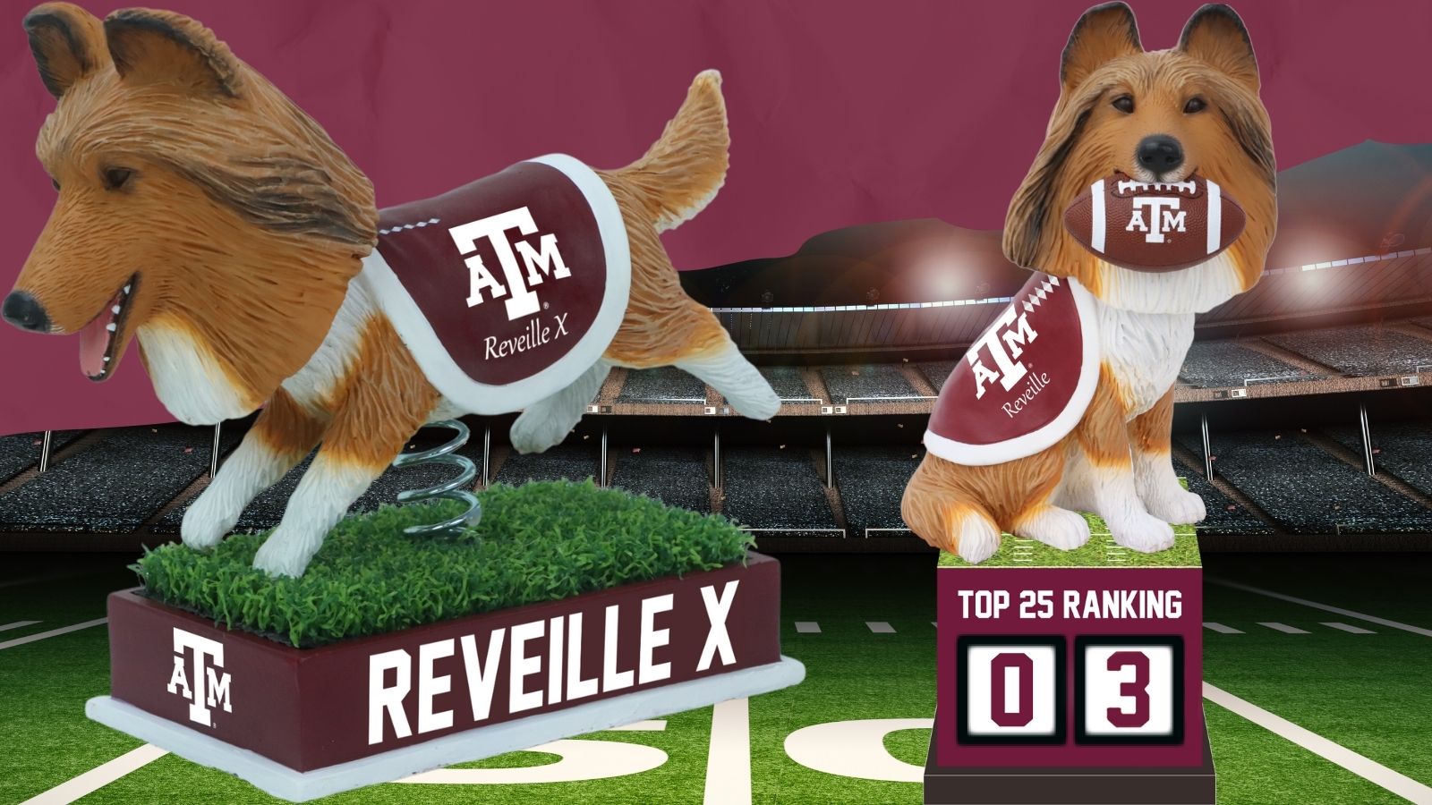 - “We’re excited to add Texas A&M to our Top 25 Ranking Bobblehead Series which has been very popular with college football fans across the country,” National Bobblehead Hall of Fame and Museum co-founder and CEO Phil Sklar said. “These two bobbleheads of Reveille will be the perfect way for Aggies fans to track the team’s ranking each week for many seasons to come and a great way for fans, alumni, students, faculty, and staff to show off their school pride all year long!”