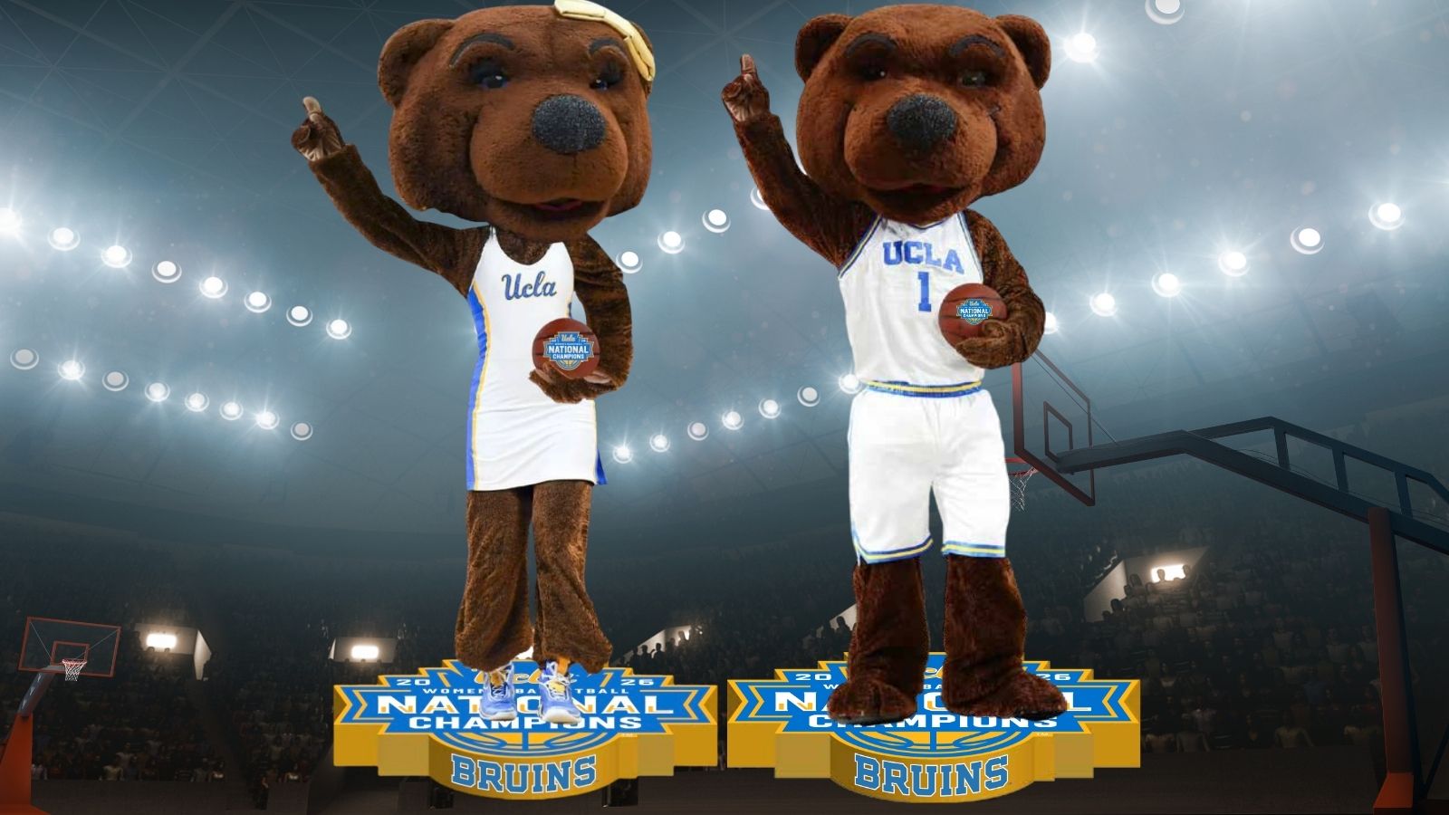 • The bobbleheads features UCLA’s mascots, Joe Bruin and Josie Bruin, standing on the official 2026 Women’s Basketball National Championship logo. Both bobbleheads are making the No. 1 sign while holding a basketball adorned with the National Championship logo.