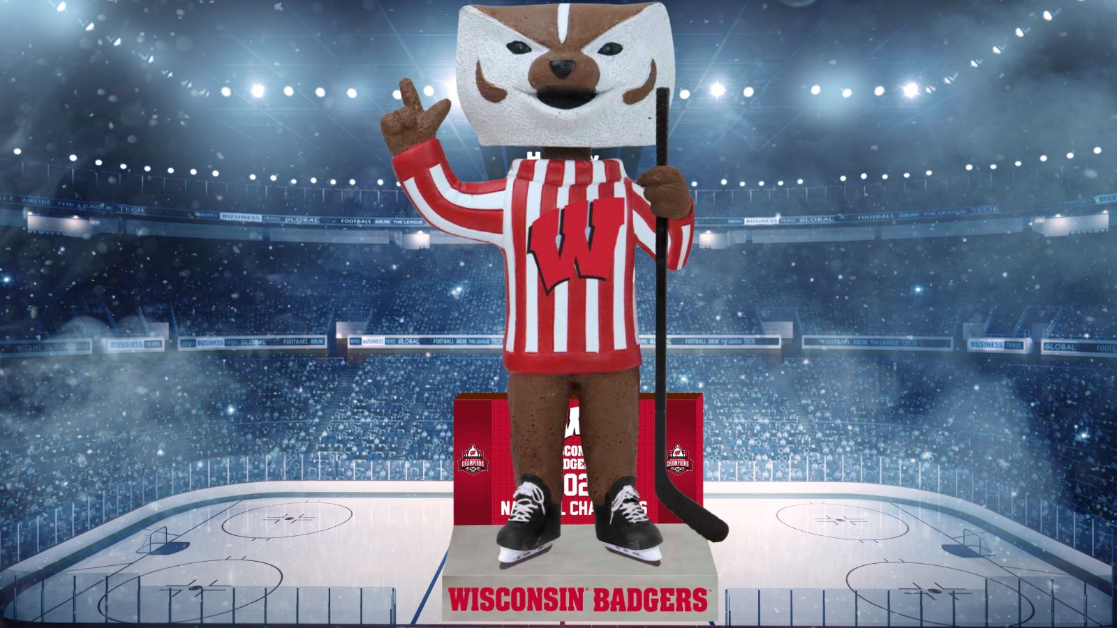 - Proudly wearing a red and white Wisconsin sweater and ice skates while holding a hockey stick, the Bucky Badger bobblehead is giving the No. 1 sign and standing on a ice-textured base featuring the UW and championship logos and a scoreboard in the background that says “WISCONSIN BADGERS 2026 NATIONAL CHAMPIONS”.